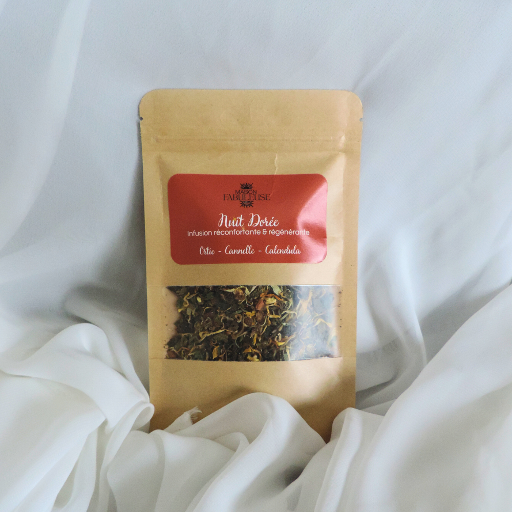🌸 Féminin Sacré – Framboisier (feuilles), achillée millefeuille, lavande : pour honorer ton cycle, ton intuition, ton équilibre intérieur. 🍂 Nuit Dorée – Cannelle, calendula, ortie : pour les soirs où tu cherches chaleur, réconfort et sérénité.
